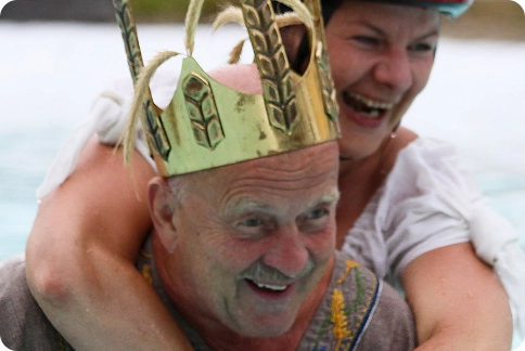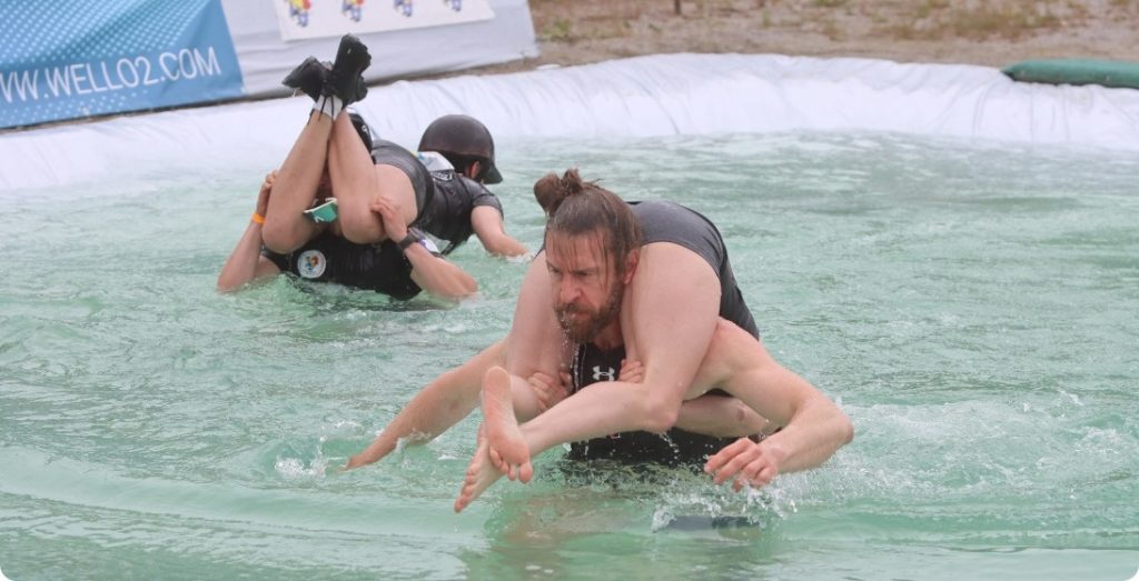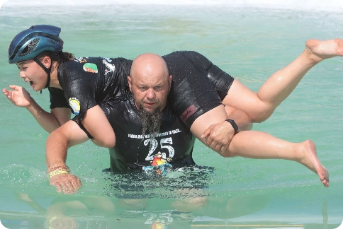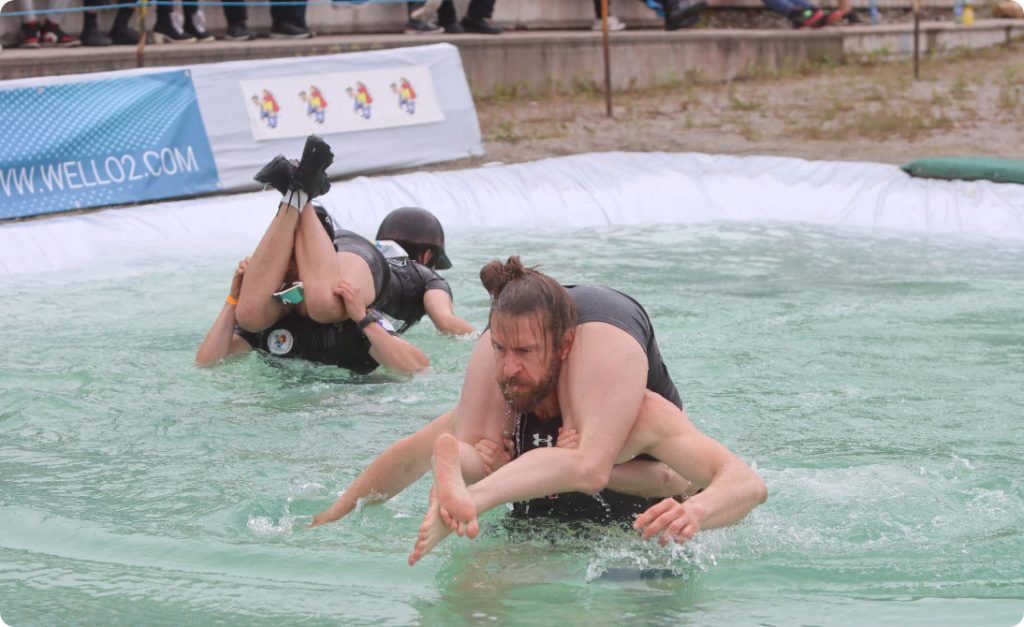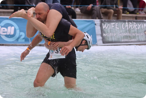 Eukonkannon joukkuekisassa kolme miestä kantaa eukkoa vuorotellen. Joukkuekisassa kolme parhaiten pukeutunutta joukkuetta saa aikahyvitystä.